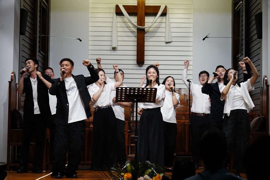 接着由青年诗班献唱《向主唱乐歌》,一首轻盈欢快的歌曲配上清纯天籁的声音,虽然有一半Ju-bi-la-te De-o听不懂的词,心却被他们的欢欣歌唱带着飞扬起来。之后,会众唱诗107首《大启乐园歌》也加入欢唱的队伍。