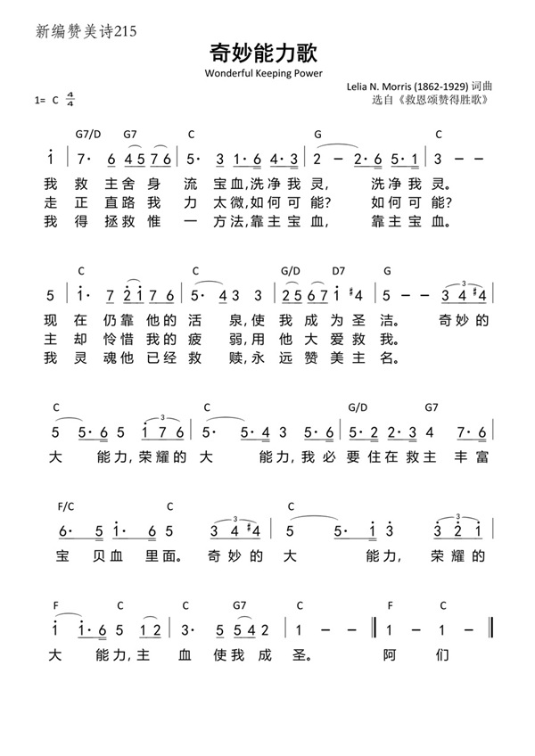 《奇妙能力歌》的词曲均出自美国女信徒莫里斯夫人(事略参阅第 91 首),其创作灵感源于一次以 “追求圣洁” 为核心的 “圣洁营” 聚会 —— 这场聚焦生命更新的聚会,成为她传递 “靠主成圣” 真理的契机,正如诗歌副歌反复咏叹的 “主血使我成圣”,直接点明了整首诗的属灵核心。与莫里斯夫人的其他作品一脉相承,这首诗因紧扣福音派 “以基督为中心、靠恩典成圣” 的信仰核心,在福音派信徒中极具影响力,而其 “奇妙能力” 的属灵内涵,恰与哥林多后书 4 章 7 节 “我们有这宝贝放在瓦器里,要显明这莫大的能力,是出于神,不是出于我们” 的真理深度契合:诗中所赞美的 “奇妙能力”,从始至终都不是人的自我努力,而是神借着宝血赐下的成圣力量,正如 “宝贝”(基督的救恩与能力)置于 “瓦器”(有限、软弱的人)中,更显神的大能超越一切人的局限。