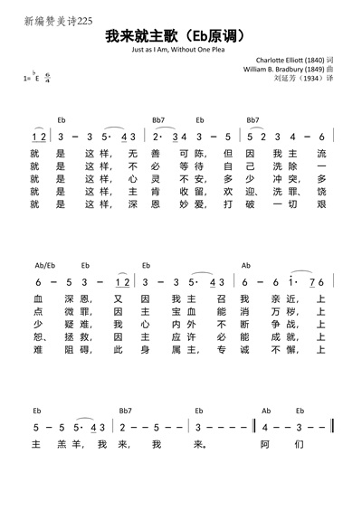 一次,全家外出筹办建筑学校的慈善义卖,卧床不起的埃利奥特因无法参与、自觉毫无贡献而心生不安。静思中,她重新领悟到信仰的根基不在自身,而在基督的慈爱、能力与应许,于是提笔写下《我来就主歌》。诗歌既真挚告白了 “上主羔羊流血深恩”,也坦率坦陈了自己 “无善可陈、飘荡不安、充满疑难” 的本相,原诗中 “我就是这样贫困、可怜、瞎眼,凡我所需要的,在主里面都得到满足” 的诗句,将福音 “因信称义” 的核心真理直白呈现。诗歌最初以约翰福音 6:37“凡父所赐给我的人,必到我这里来;到我这里来的,我总不丢弃他” 为标题发表,起初匿名流传,直至医生将印行的单张拿给埃利奥特看,她才公开作者身份。