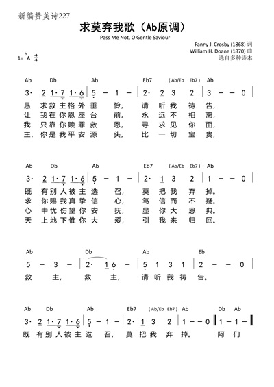 这首著名的福音圣诗,是盲诗人克罗斯比(事略参阅第11首)与威廉·多恩(事略参阅第11首,见第3首注①)于1868年合作的佳作。一日,多恩写下诗歌第一句后难以为继,便找到曾有过良好合作的克罗斯比。盲诗人听罢,结合自身与主相交的亲身经历,接续完成了这首传世名歌——神从未弃绝这位失明的诗人。