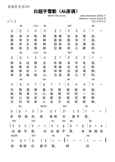 本诗由著名作曲家费希尔(事略参阅第214首)谱曲,调名《白超乎雪(WHITER THAN SNOW)》,亦名《费希尔(FISCHER)》。