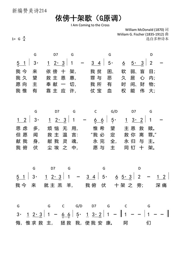 这首诗的曲调由美国业余圣诗作曲家费希尔(W.G.Fischer,1835—1912)谱写,调名《信赖(TRUSTING)》恰与诗歌 “依傍十架” 的核心信心相呼应。费希尔虽非专业音乐人,却凭对圣乐的热爱深耕不辍:青年时在费城德语教堂学习唱诗,曾以装订图书为业,仍坚持夜校攻读音乐;他精通钢琴演奏、合唱团指挥,还常受邀为教会教授唱诗、指导诗班。其创作的曲调兼具 “柔和” 与 “坚定”—— 柔和的旋律贴合诗歌 “感人的呼声”,让 “来到十架前” 的呼召更显温柔恳切;而稳定的节奏又传递出 “信赖主” 的信心力量,与歌词中 “奉献身心灵魂” 的坚定委身形成共鸣。费希尔一生谱写 200 首福音圣诗曲调,其中《新编》收录的第 214、229、347 首与《依傍十架歌》一样,因贴合教会敬拜需求而广传,成为跨越时代的圣乐遗产。自 1870 年问世以来,《依傍十架歌》更被译成多国文字,成为全球教会在救恩呼召与生命委身主题下的重要敬拜曲目。