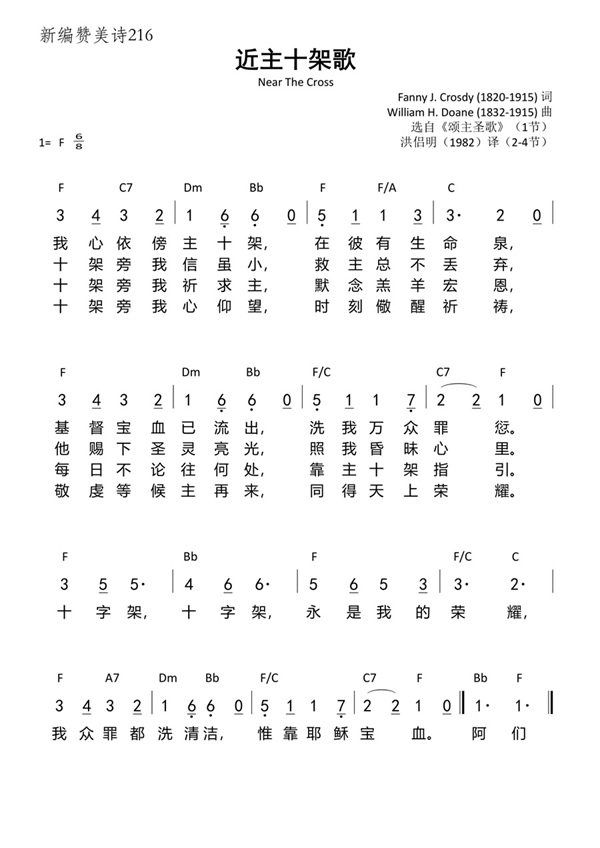 《近主十架歌》是美国女盲诗人克罗斯比(事略参阅第 11 首)笔下最优美、最流行的圣诗之一,其诞生带着 “词曲相生” 的独特印记 —— 先由多恩(事略参阅第 11 首,见第 3 首注 1)谱好曲调,再邀请克罗斯比创作歌词,因二者贴合度极高,调名便定为《近乎十架(NEAR THE CROSS)》。这首诗最早收录于布雷德伯里所编的《明珠(BRIGHT JEWELS)》一书中,1869 年在纽约出版,自问世后便广为流传,尤其副歌 “十字架,十字架,永是我的荣耀”,更是成为奋兴会上常闻的短歌,早在 20 世纪三十年代,我国教会便已频繁唱颂。