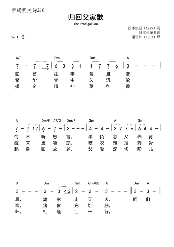 《归回父家歌》是一首承载日本文化特色与基督教核心真理的圣诗,其传播历程与版本演变紧密相连。早在《普天颂赞》(旧版)中,它便以《念父归来歌》之名收录,注明为 “日本圣诗及曲调”,旧译歌词如 “思之惭愧不能当!离父我彷徨”“黄昏将过,日将来,我今决意归”,虽语言古雅,却清晰呼应了耶稣 “浪子回头” 的比喻(路加福音 15:11-32)—— 诗中 “离父奔忙” 的迷途状态、“倦眠茅草房” 的落魄处境、“念父爱而决意归” 的悔改之心,正是对浪子从背离到归回父家的生动写照。因旧译稍显晦涩,《新编》收录时特意邀请谢雪如(简历参阅第 32 首)重译,并明确标注原作者为日本信徒松本宗吾(Sogo Matsumoto),让诗歌的真理内涵更易被当代信徒理解。