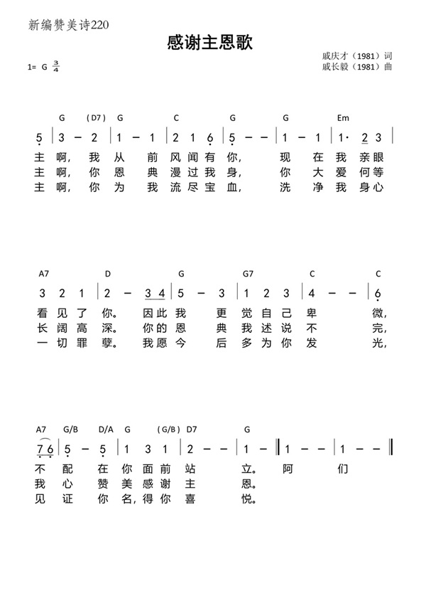 这首诗的曲调由戚庆才牧师的儿子戚长毅长老谱写,其创作过程与音乐表达,同样紧扣 “感恩与谦卑” 的核心。戚长毅生于 1938 年,1963 年毕业于上海体育学院,虽以体育教师为业、未接受专业音乐训练,却因家庭环境的熏陶,不仅拥有好歌喉,更对圣乐有深厚情感 —— 沐恩堂、怀恩堂复堂后,他常于礼拜前带领教唱赞美诗。为《感谢主恩歌》配曲时,他深知诗歌需承载 “数算神恩、深化对神认识、谦卑顺服” 的内涵,因此特意选用温柔缓慢的旋律:没有激昂的节奏,却以平稳的音符递进,模拟信徒在神面前安静感恩的心境;即便曲调揉合了他过往熟悉的圣歌元素,却与 “见证神恩、谦卑悔改” 的词意高度契合,让 “感谢” 不再是口号,而是透过旋律传递的真挚心声。